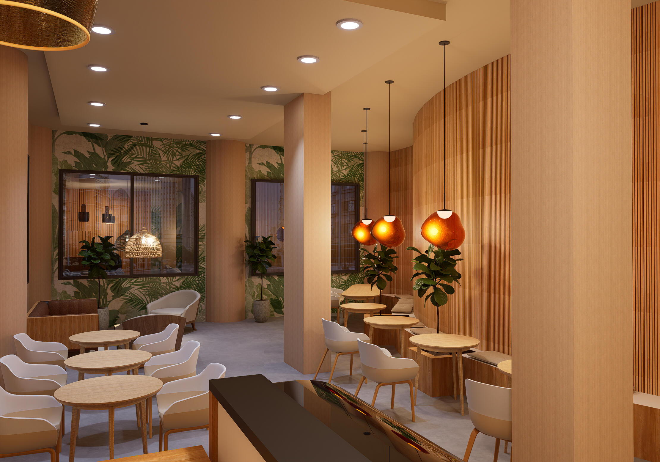 Guru Cafe is a redesigned coffee shop and lounge at a business hotel in Quatre-Bornes, Mauritius. The space utilizes natural tones, wood textures, and strategic lighting to create a welcoming atmosphere. Seating arrangements cater to different group sizes, and biophilic design elements are integrated. The design establishes a visual link with the hotel's lobby.