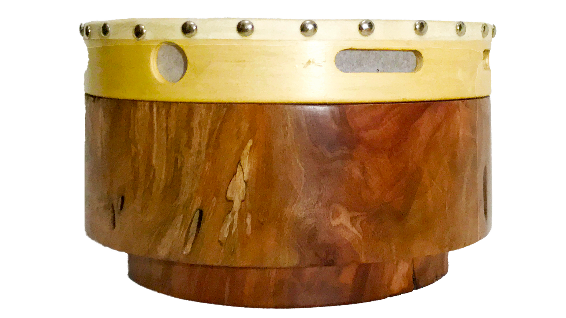 The Kreol Lamp is a unique lighting piece combining Mauritian cultural heritage with artisanal craftsmanship. The upper part features an authentic ravann drum body with a goat hide top, which allows a warm 2800K light to subtly permeate, in addition to shining through the drum's circular cutouts. The sturdy base is made from local Mimusops coriacea wood, handcarved individually by local artisans using chisels and hammers.Dimensions: Radius 250 mm, Height 160 mm